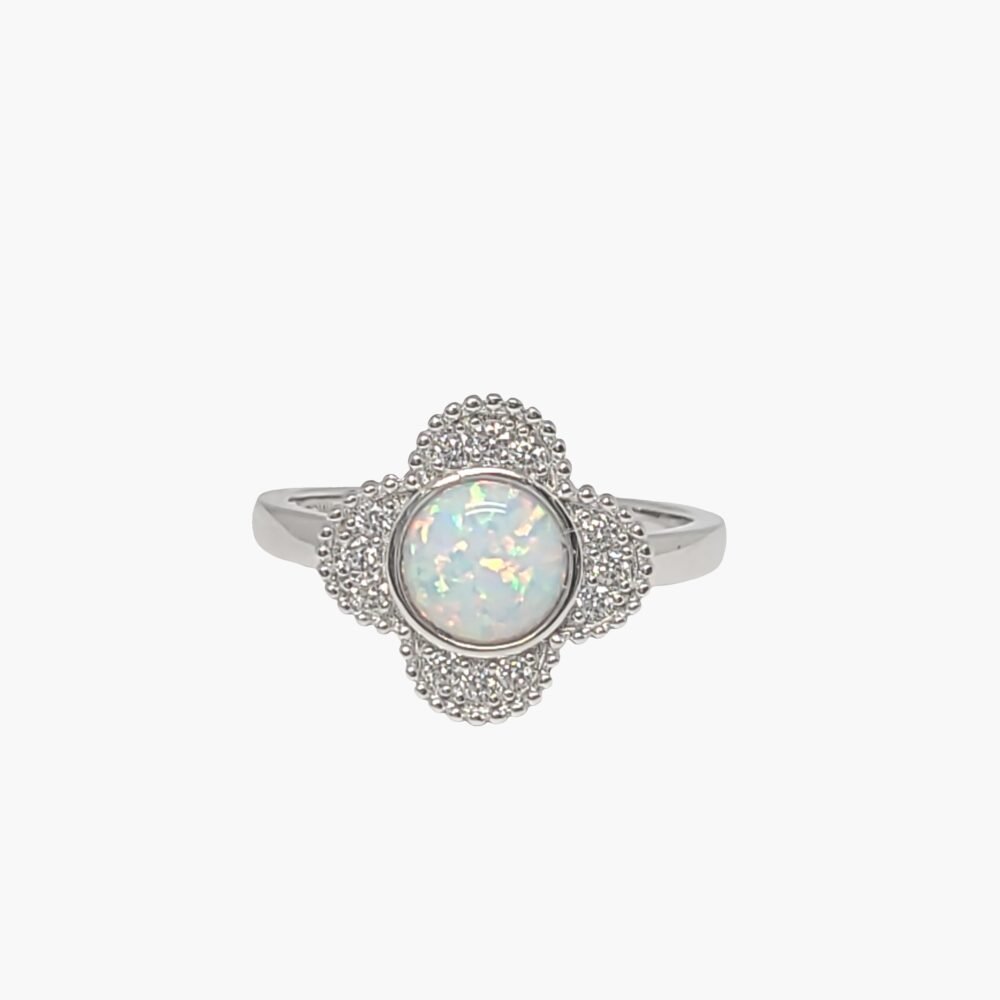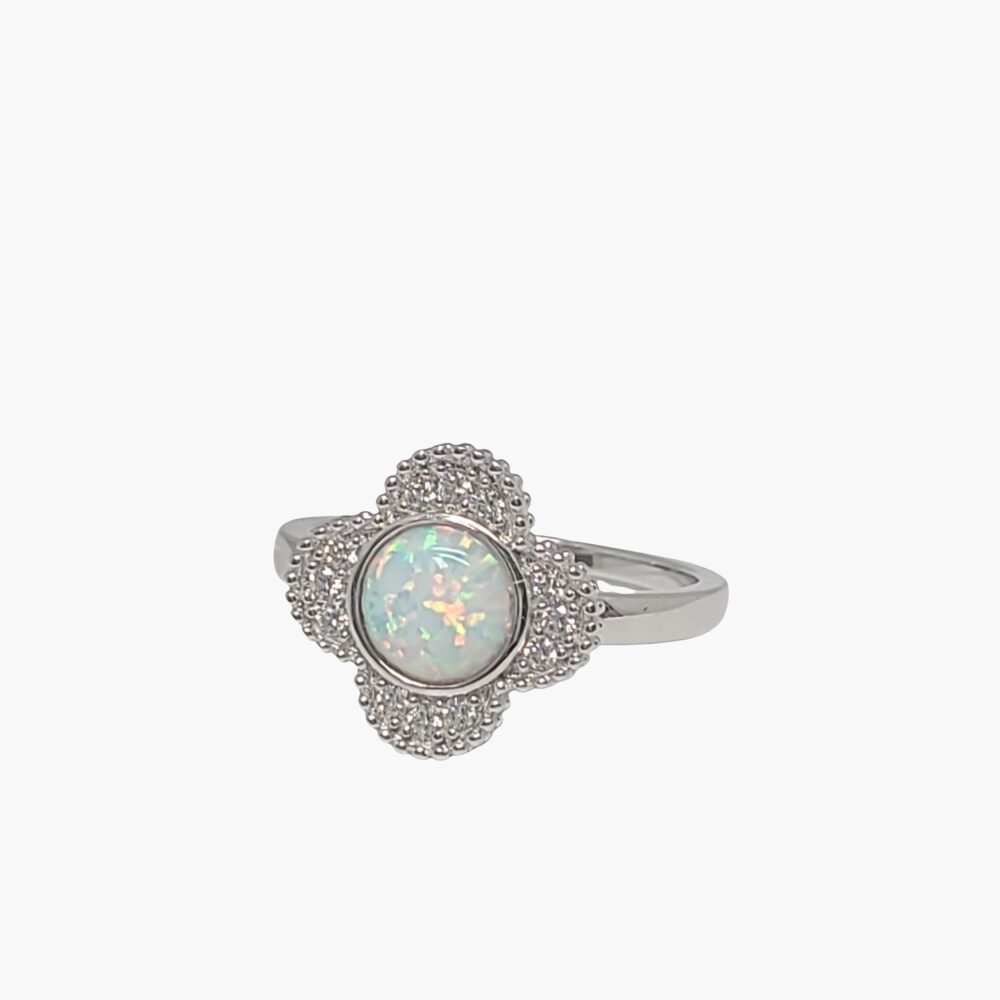 White Opal Clover Leaf Ring With White Sapphire Accents