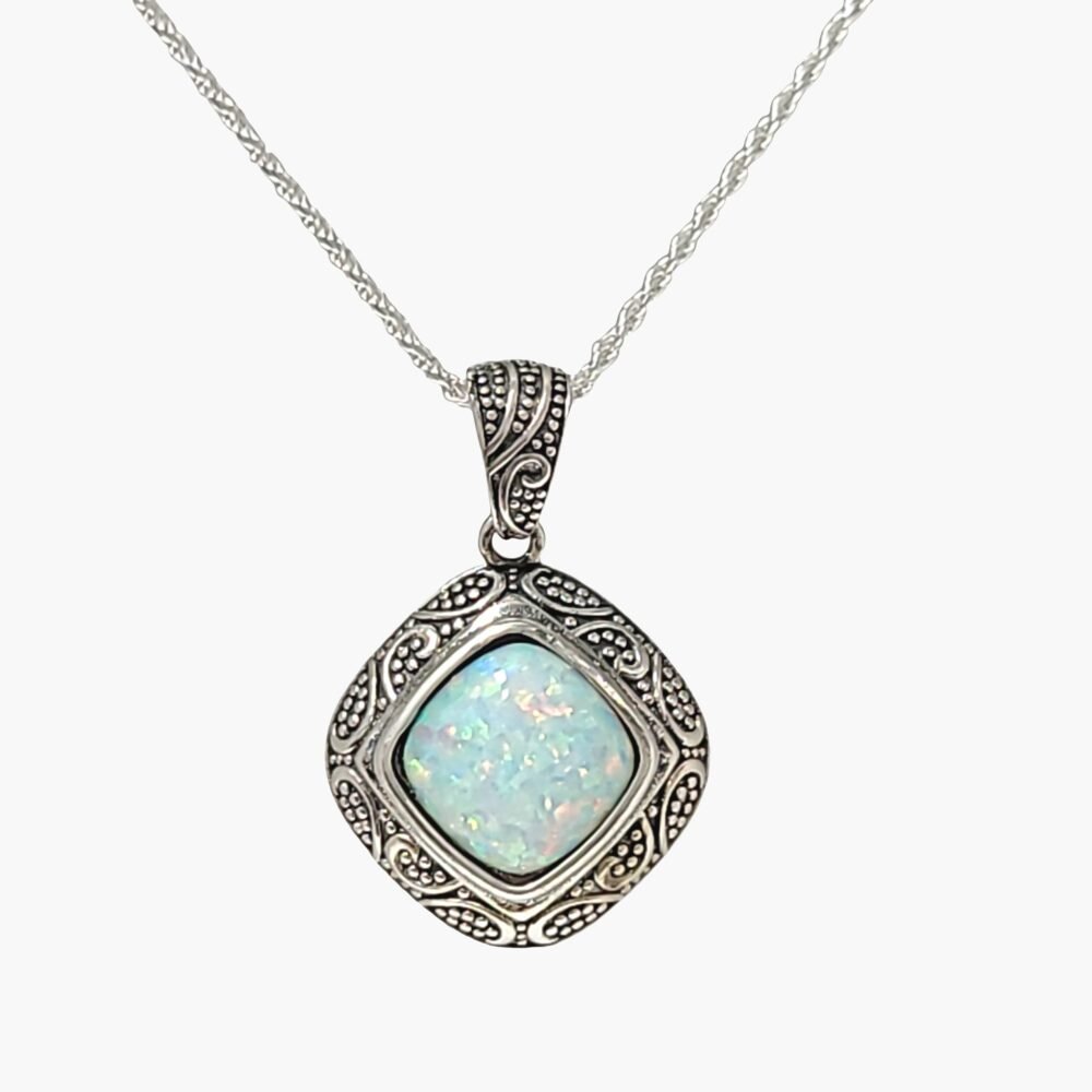 White Opal 10x10mm Cushion Cut Oxidized Sterling Silver Pendant