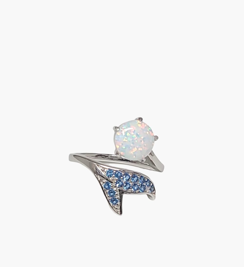 White Opal Whale Tail Ring, 8mm With Blue Topaz Accents, Adjustable Ring 6-9